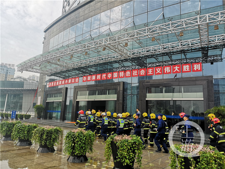 随即,各楼层疏散方案立即启动,同时,江北区消防支队立即出动江北城中队、港城中队6台消防车,50名救援人员赶赴现场处置,使用无人机及消防机器人在“火场”模拟开展现场侦查及扑救任务,医疗救护组、安全警戒组、后勤保障组、通讯联络组、工程保障组同步到位。经过半小时的联合作战,演练任务圆满完成。