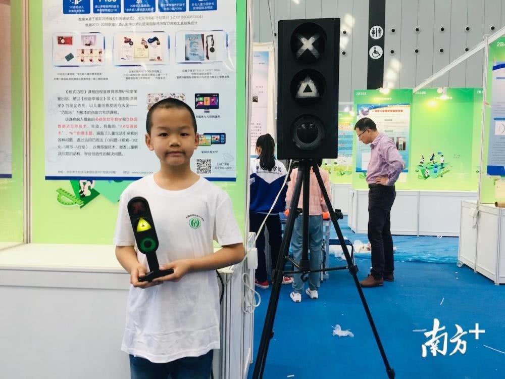 在青少年发明创新展区,年仅7岁的颜百宽正在筹备着展出其发明的“色盲人行红绿灯”。“我发明色盲人行红绿灯是因为邻居高奶奶。她是一个色盲人,分不清红绿色。因为被车撞而去世了,我很伤心。于是我把这个问题带到了幼儿园,跟大家一起讨论。”颜百宽说。