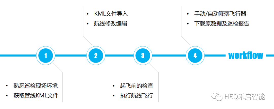 以DJI 行业飞行平台M200 V2为例,进行四步巡检作业(1.熟悉巡检现场环境,获取管线KML文件;2.KML文件导入,航线修改编辑;3.起飞前检查,执行航线飞行;4.手动/自动降落飞行器,下载原数据及巡检报告)。