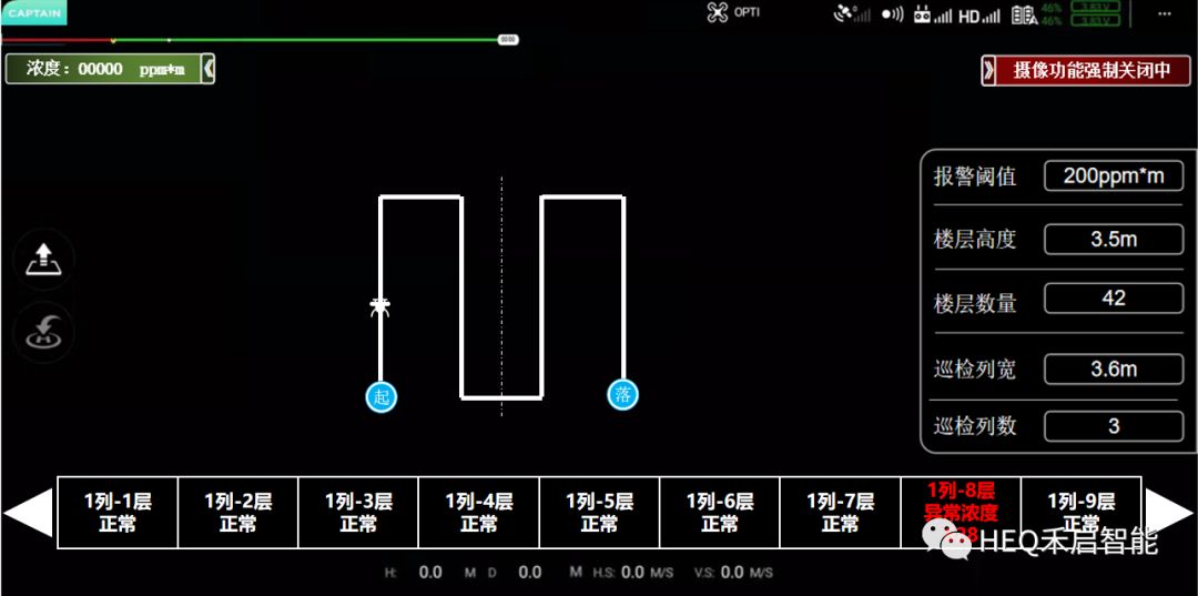 根据居民楼情况进行简单设置(楼层高度、楼层数量、巡检列宽、巡检列数),确定合适的起飞点即可完成自主巡检。对于航线不规则区域可进行手动巡(飞行平台悬停状态下控制云台进行检测)。CH-4 无人机激光甲烷遥测仪仅需0.1S即可完成目标点的泄漏检测,巡检过程中无人机无需停顿即可完成。