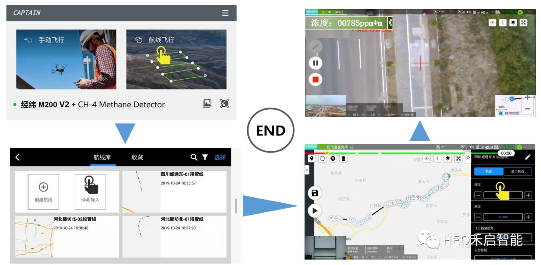 利用地面站软件进行航线规划,轻松实现中长距离管线巡检作业,巡检过程中可实时查看当前巡检状态(无人机状态、遥测仪状态、测量结果),如遇泄漏系统将自动进行声光报警并记录数据(时间、坐标、泄漏浓度、现场照片)以生产巡检报告。