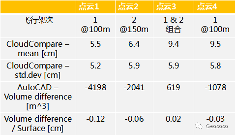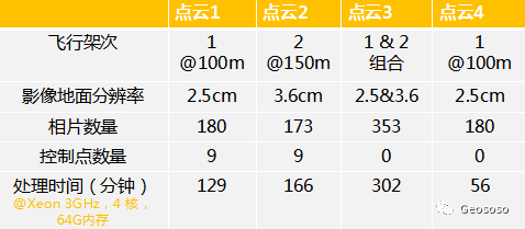 根据对比策略,分别处理有控制点和无控制点在不同飞行高度的数据,共得到四组点云,数据情况如下: