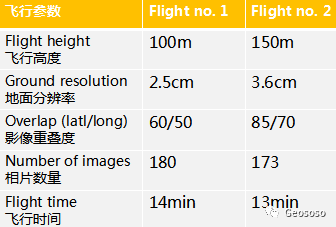 飞机型号:senseFly eBee plus相机型号:S.O.D.A RGB飞控软件:eMotion 3处理软件:Agisoft PhotoScan机载RTK:接入瑞士CORS VRS差分服务 飞行计划:为对比不同飞行高度对精度的影响,分布进行两次飞行,具体参数如下: