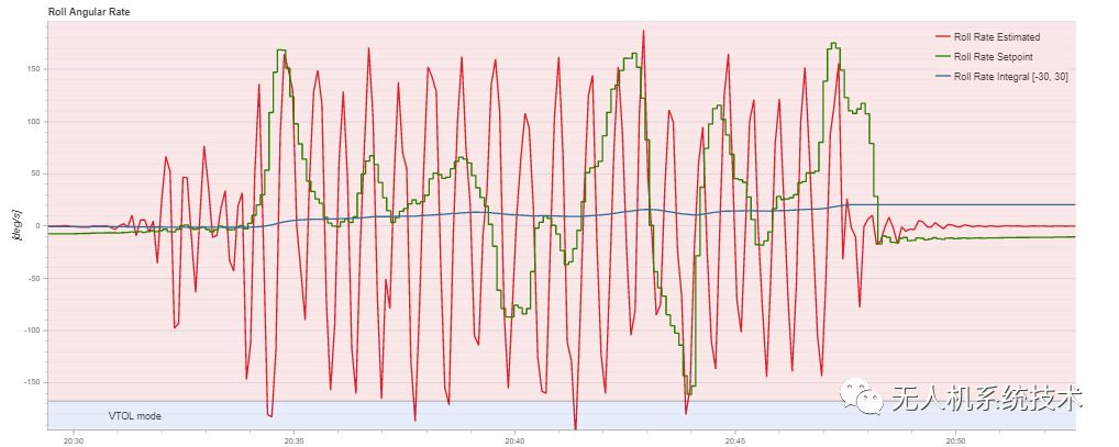 4、再调试参数MC_ROLLRATE_I,也是每次增加10-20%直到飞机出现小幅震荡,缩减为60-70%,此参数主要用于消除跟踪静差,参数太小会导致无法应对外界扰动;