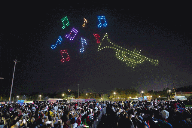当晚,300架携带七彩霓虹灯的无人机缓缓升空,拉开晚会序幕。夜幕下,无人机编队变换着队形、变幻着灯光,灿若星辰。“中国沉香之乡”、“冼太夫人故里”、“水东湾跨海大桥”“好心茂名”等一幅幅绚丽的文字、图形灯光秀轮番呈现,演绎电白城市发展变化的蓬勃生机。