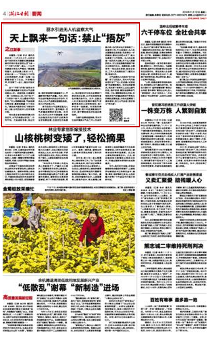 11月12日,浙江日报刊发《丽水引进无人机监察大气 天上飘来一句话:禁止“捂灰”》一文