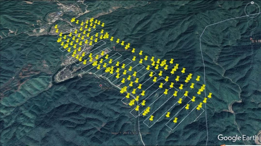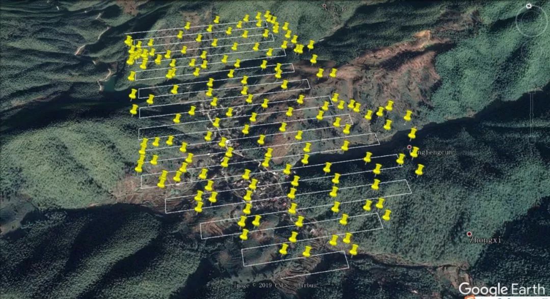 飞机到达起始点,沿航线方向飞行,下图黄色标点为GoogleEarth Pro中显示的变高点,飞机沿航线方向向前探测高度变化,根据变高点来确定变高高度,进行仿地变高飞行,完成测区数据采集。