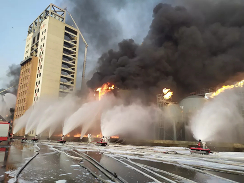 演习现场,化工园区液化石油气泄露失控,随后发生爆燃,地面形成流淌火,并有两名技术人员受伤被困,救援人员无法靠近,18台消防灭火机器人代替消防员抵近作业,兵分三路: