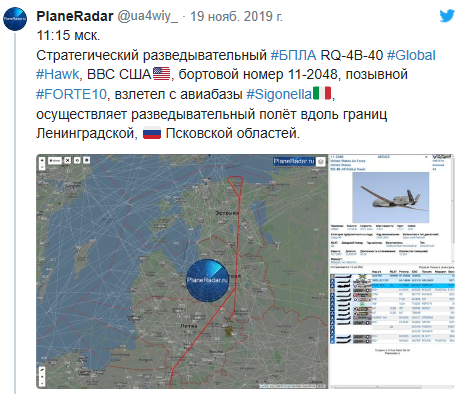 俄航空资源网Plane Radar 19日数据显示,两架RQ-4B全球鹰无人机从美军在意大利西格尼拉的军事基地起飞,沿着加里宁格勒、列宁格勒和普斯科夫地区边境侦察。
