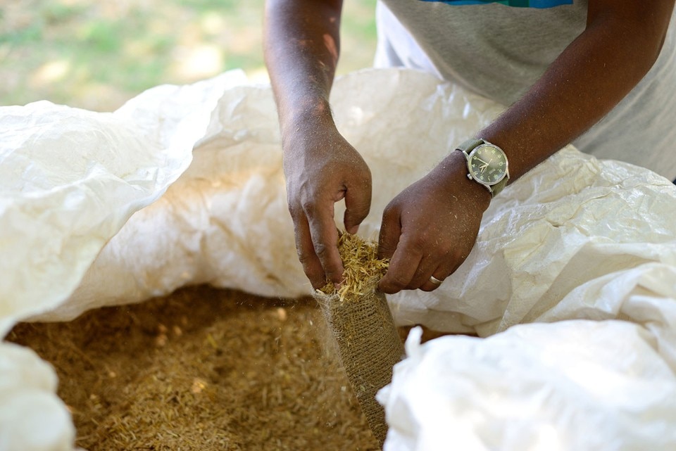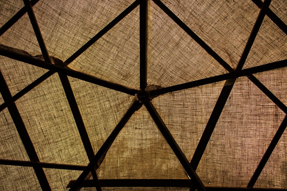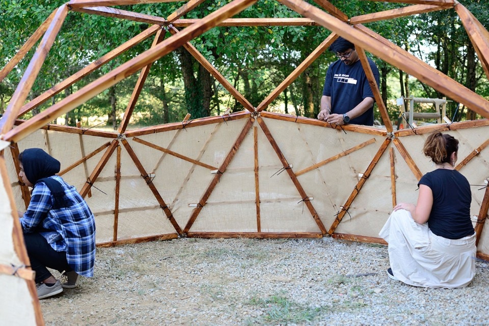 Stephanie Chaltiel:Boisbuchet是我有幸经营过的最好的制造车间。讲习班团队效率很高,一切都得到了便利。我们有一群非常有动力的学生,其中一些人和我的同事Muhammed Shameel来自迪拜。我们仅用了一个小时就构建了一个测地线骨架,然后将其附着在装满干草的2.000个黄麻小袋中,然后进入无人机喷涂阶段。这也是我们第一次强调无人机喷涂技术的效率,因为整个圆顶仅在10分钟内就完成了喷涂。在湖边的位置很神奇,我想每个人都喜欢圆顶。当进入内部时,即使结构没有门,您也不会感觉到外部声音。另外,我们用纺织品覆盖了内部,给人一种非常柔和的感觉。得知它的感觉令人心碎。至少要再喷洒一次无人机至少一周才能获得足够的厚度,而要在雨中保护一个月才能永久可行。但这无疑是我们为伦敦项目付诸实践的不可思议的学习。