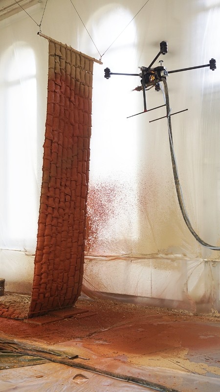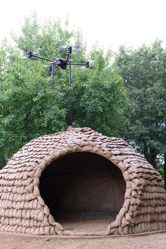来自法国的天才建筑师Stephanie Chaltiel 花了多年的研究已目前使用的无人机创新的施工方法。无人机配备了可以将生物材料层施加到轻型结构上的喷射软管。建筑师或建筑工人创建这些基础结构,然后无人机完成了工作。该工艺非常适合轻型或临时结构。使用此方法可避免使用脚手架或重型机械,从而大大减少了施工时间。