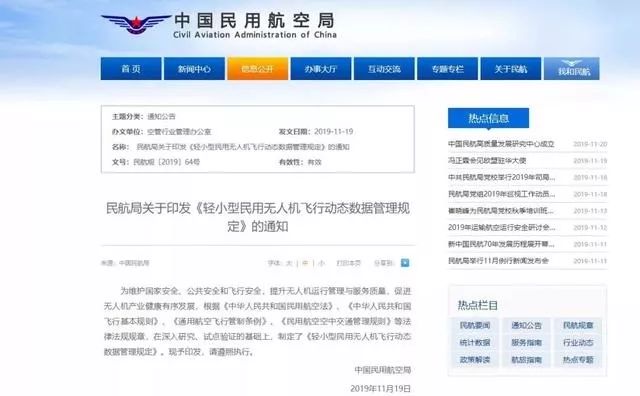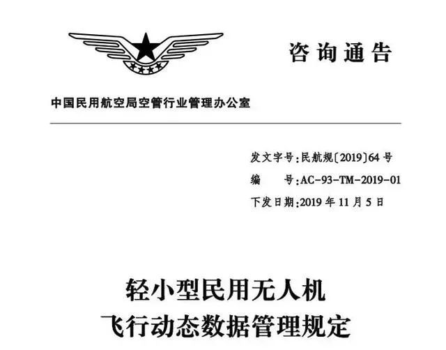 2019年11月19日,民航局在其官网上贴出印发《轻小型民用无人机飞行动态数据管理规定》的通知。通知称为维护国家安全、公共安全和飞行安全,提升无人机运行管理与服务质量,促进无人机产业健康有序发展,根据《中华人民共和国民用航空法》、《中华人民共和国飞行基本规则》、《通用航空飞行管制条例》、《民用航空空中交通管理规则》等法律法规规章,在深入研究、试点验证的基础上,制定了此规定,现予印发,请遵照执行。