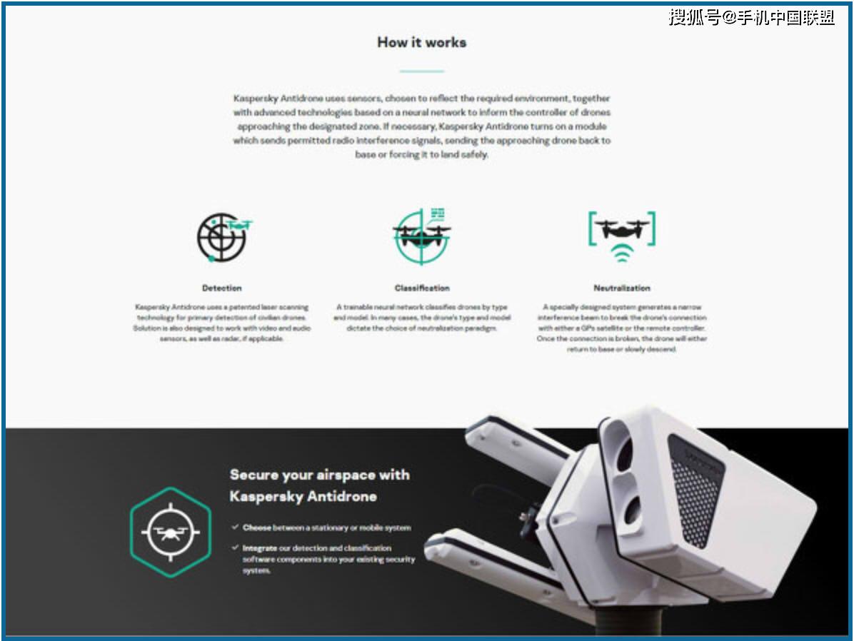 为了应对这种状况,卡巴斯基开发出了“Kaspersky Antidrone”系统。该系统使用雷达和摄像头对领地进行监视,一旦发现飞行物体将通过激光扫描仪对其进行定位,通过摄像头对其进行跟踪。再运用AI技术识别该物体是否为无人机,一旦物体被识别为无人机,系统将对其发送无线电使其迫降。