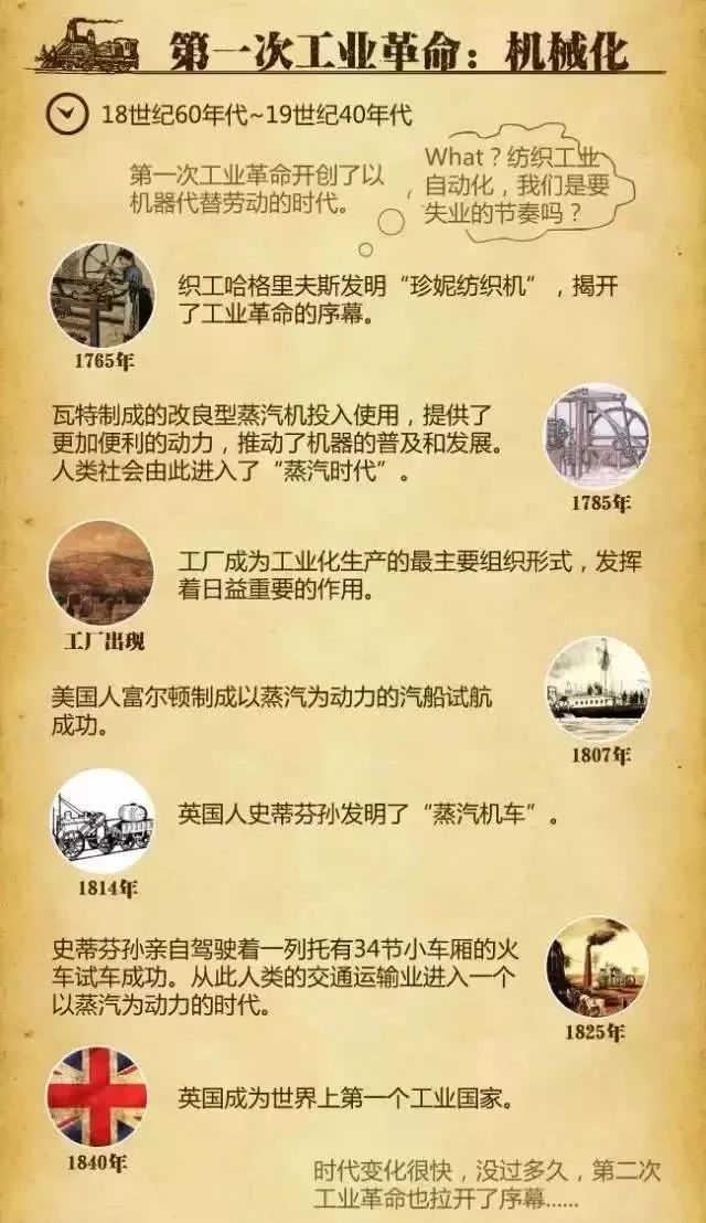 要想把无人机从现在偶尔玩玩的玩具Drone变成像天上成群鸟群自由飞翔的UAV,这应该属于一个工业革命的范畴和进程了,一场工业革命需要多少年,我们看看人类历史上的几次工业革命: