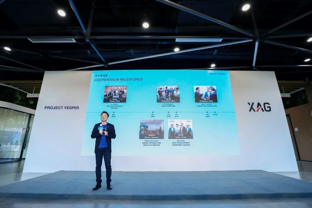2019年11月25日,欧洲空中客车股份公司与广州极飞科技有限公司在广州举行物流无人机试运行演示。这款首次亮相、代号为 Vesper 的飞行器由欧洲空客与极飞科技共同研发,项目合作协议签署于 2019 年 7 月 2 日世界经济论坛,由空中客车防务与航天首席执行官德克·霍克与极飞科技创始人彭斌共同签署。