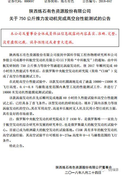 接到中国科学院工程热物理研究所和公司参股公司成都中科航空发动机有限公司(以下简称“中科航发”)的通知,由中科航发研制的750公斤推力等级中等涵道比涡扇发动机,继2017年顺利完成60小时持久性能试车考核后,在俄罗斯中央航空发动机研究院(简称“CIAM”)完成了高空台性能测试工作。