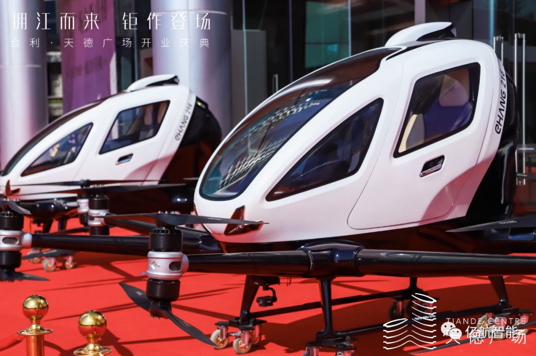 庆典上,亿航智能与合利创兴联合展出以“广州001号”空中的士为首的6架电动载人级自动驾驶飞行器“亿航216”列队亮相。