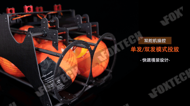 此装置由7075航空铝合金和碳纤维材料制成,在保持更轻自重的同时为主体提供了牢固的支撑结构。它有高品质双舵机操控,可单发、双发模式投放。同时它的独特快拆设计及可快速装填的手宁螺丝撞弹设计,可快速填装补充灭火弹,高效执行灭火任务,从而保障工作人员的人身安全。此灭火弹抛投装置可同时装载6个灭火弹,并配置图像回传系统,可进行精准定位抛投及抛投效果查看。
