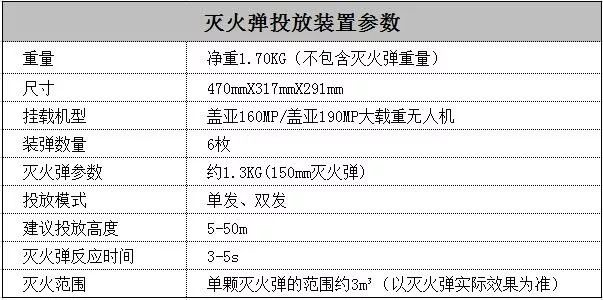 目前,公司推出的无人机消防应用方案,有两款大载重无人机可供选择,分别是盖亚160MP和盖亚190MP,最大负载分别为30kg、35kg,可有效负载灭火弹的重量。