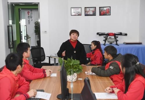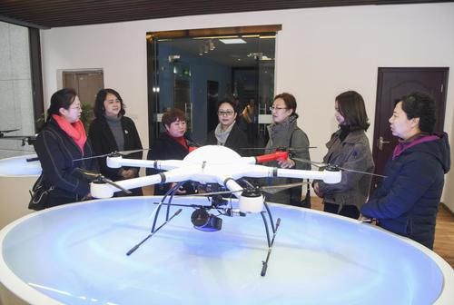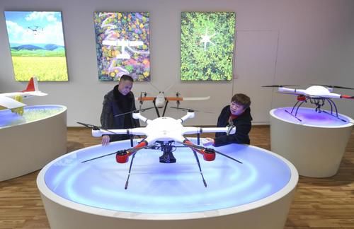 12 月 5 日,鲜敏(左三)在自己创立的航空科技公司产品展示中心向参观者介绍无人机产品。