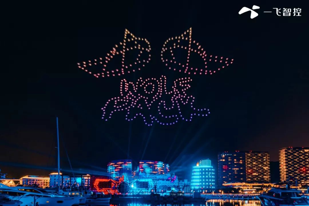 无人机阵型不断变化,BHM&WUCG 、电音节LOGO、Raver笑脸、Wolfpack 狼头一一闪现,与夜空交相辉映,极具视觉冲击,现场观众纷纷拿出手机拍摄记录下这一幅幅科技美景,并爆出阵阵惊叹,最后,本次飞行随着“我爱三亚”的字幕中,完美落下帷幕。