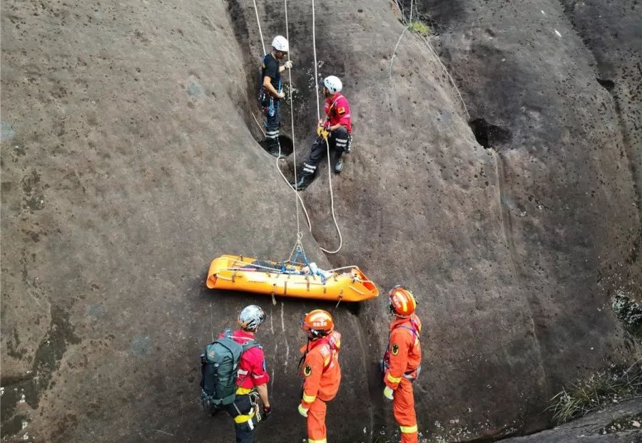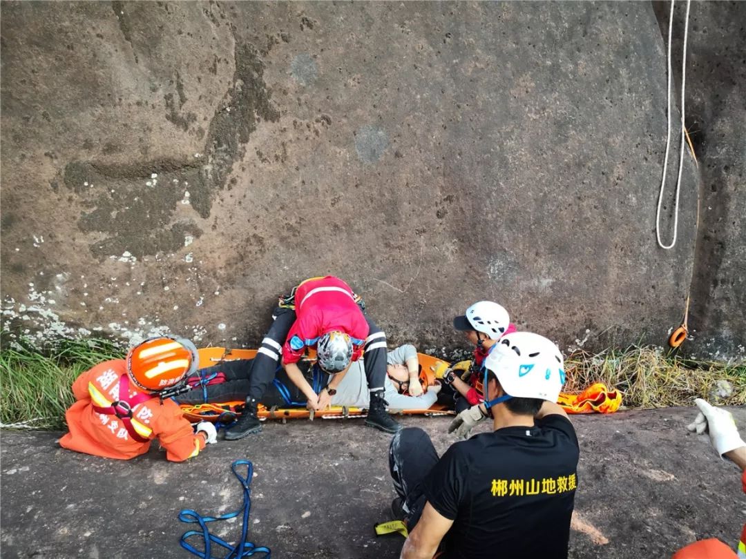 使用绳索提升系统,将刘某转移至山顶随后,郴州山地救援队到达现场了解崖底情况和刘某伤情后,现场指挥员制订救援方案,通过救援绳索向崖底投放担架等救援设备,同时安排4名山地救援队员下降到崖底协同救援。救援人员对刘某受伤部位进行包扎固定,防止二次伤害,将其抬上救援担架做好安全保护措施后,使用绳索提升系统上下配合将刘某转移至山顶。在救援人员下小心翼翼的保护下,救援担架一点一点向上提升。通过救援人员的密切配合,成功将刘某救出,经现场医务人员检查,刘某脚跟骨粉碎性骨折,脚踝骨折,腰椎二三节压扁,随后送往医院救治。
