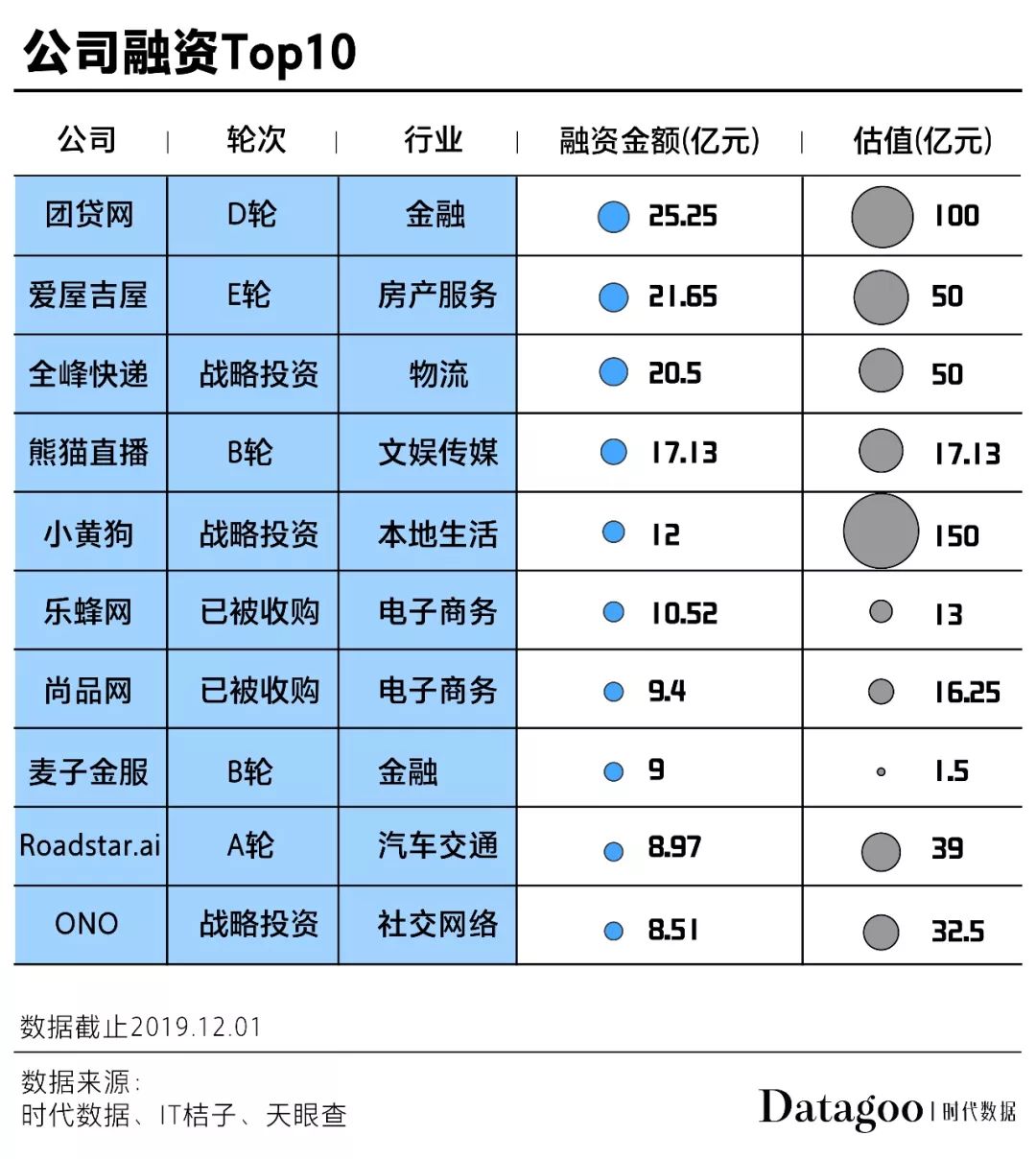 但是,估值最高的是小黄狗,估值达到150亿元。团贷网和爱屋吉屋分别以100亿元估值和78亿元估值位列二、三。全峰快递和熊猫直播以50亿元估值并列第四。