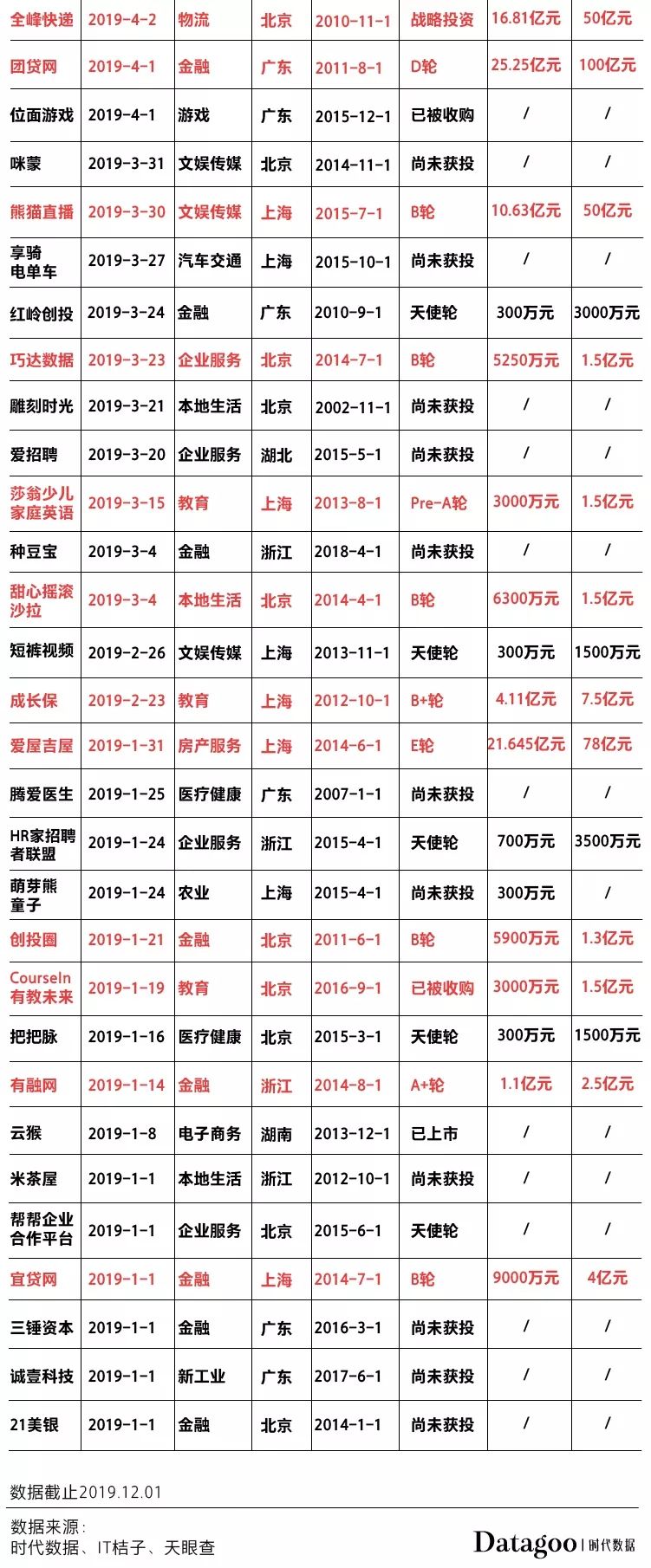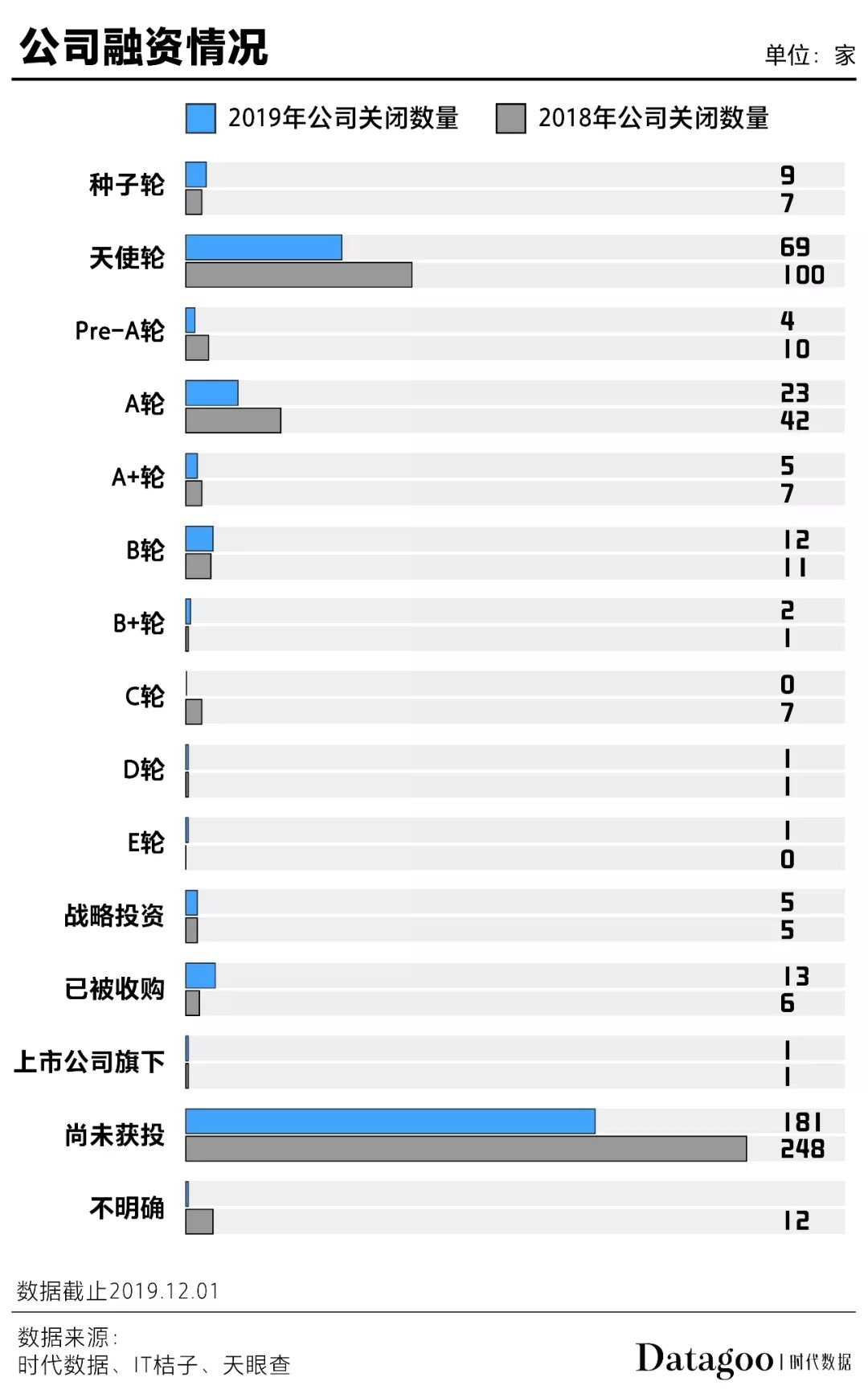 相较之下,去年一共有458家创业公司关闭,但在2018年12月份关闭的创业公司高达348家,占去年全年的76%。这也意味着,今年前11个月关闭的公司已是去年同期的3倍。