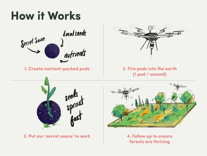 Flash Forest配备有气动发射装置的重型无人机,可以将包含种子的豆荚以理想的深度插入土壤中。每个定制的豆荚至少包含三粒预发芽的种子,菌根,肥料和其他植物喜爱的成分。种子在插入地下之前已经发芽,在进入土壤之后有望继续生长,并且发育出强大的生根系统。