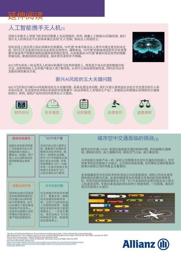 京东安联财产保险有限公司AGCS部门总监彭衍滨先生认为,UAS在未来有潜力解决众多行业的挑战,提高工人的安全性并降低成本。“未来十年,UAS在商业保险中的应用将有所增加,因为它们可以有效地执行机械性或危险的任务。它们成本低,可以取代人工在危险的工作环境中作业,同时提供广域视野来观察如沼泽或矿井等难以到达的地方。它们可用于勘测农作物,巡逻边境,为搜救任务提供侦察,报告交通状况或新闻,考察野生动物,探测管道,为破冰船提供预警系统,调查石油泄漏,执行环保法规,监管渔业,拍摄电影和提供救灾援助等。”