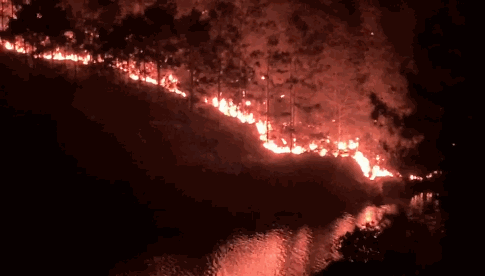凌云山地区植被以马尾松为主,遇火易燃难灭。针叶林的环境,为树冠火的产生制造了有利条件。在大风的作用下,树林间未燃尽的火花跨越山间水库,飞至一公里外的另一处山林,引发了“飞火”,新的火情愈演愈烈。