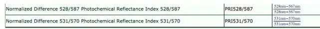 --530nm:叶黄素(类胡萝卜素)敏感绿色带,与叶片叶绿素光能利用效率和光合作用,及生理学研究相关。PRI-生理反射指数在VIS-NIR波段(一般用531及560nm)。