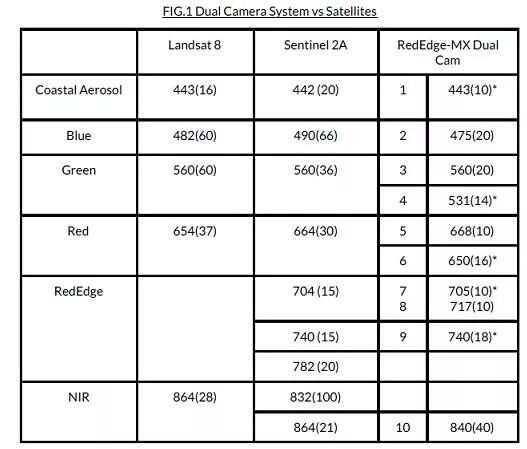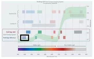 RedEdge- MX Dual与Landsat 8和Sentinel 2A卫星的中心波长及带宽对比: