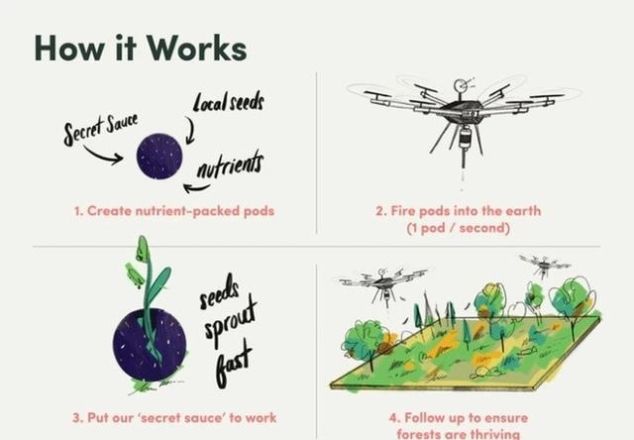 一个由加拿大理工科毕业生组成的团队正在努力实现到2028年利用无人机种植10亿棵树。这个项目被称为Flash Forest,它结合了无人机使用、特别设计的豆荚和加速种子发芽过程。据Flash Forest称,该技术的植树速度比一个工人快10倍,成本比传统植树方法便宜80%。