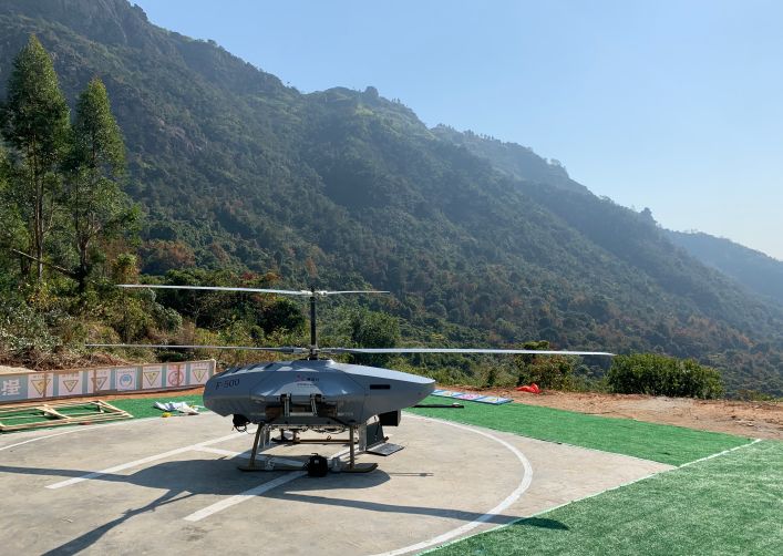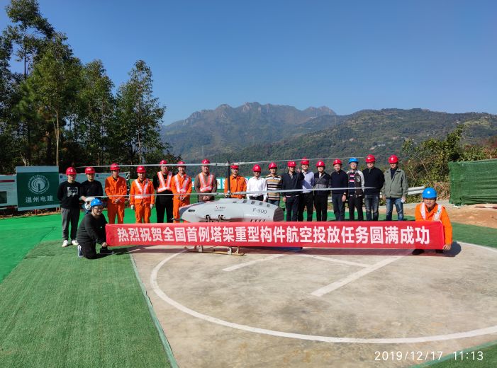 此次任务飞行验证了F-500重载共轴式直升机的载荷能力、抗风能力、可靠性、稳定性。F-500吊运投放系统可负载投放150公斤重物,投放前后机体姿态无变化。F-500体积小、载荷大的优势,在此次山区复杂地形作业得到充分展现,只用一台厢式小货车即可将直升机运到山腰起降点,并在很小的起降空间完成起降。这是其他布局的同量级无人直升机(单旋翼、纵列式)难以实现的。F-500重载共轴式无人直升机吊运系统经4个架次,一天内将数百公斤塔架钢结构飞行吊运投放至施工地点,完成了原本需要8名工人+3匹骡马耗时25-30天的工作量,极大的提高了工作效率。同时避免了由于修路及搬运带来的植被、树木破坏的严重问题。
