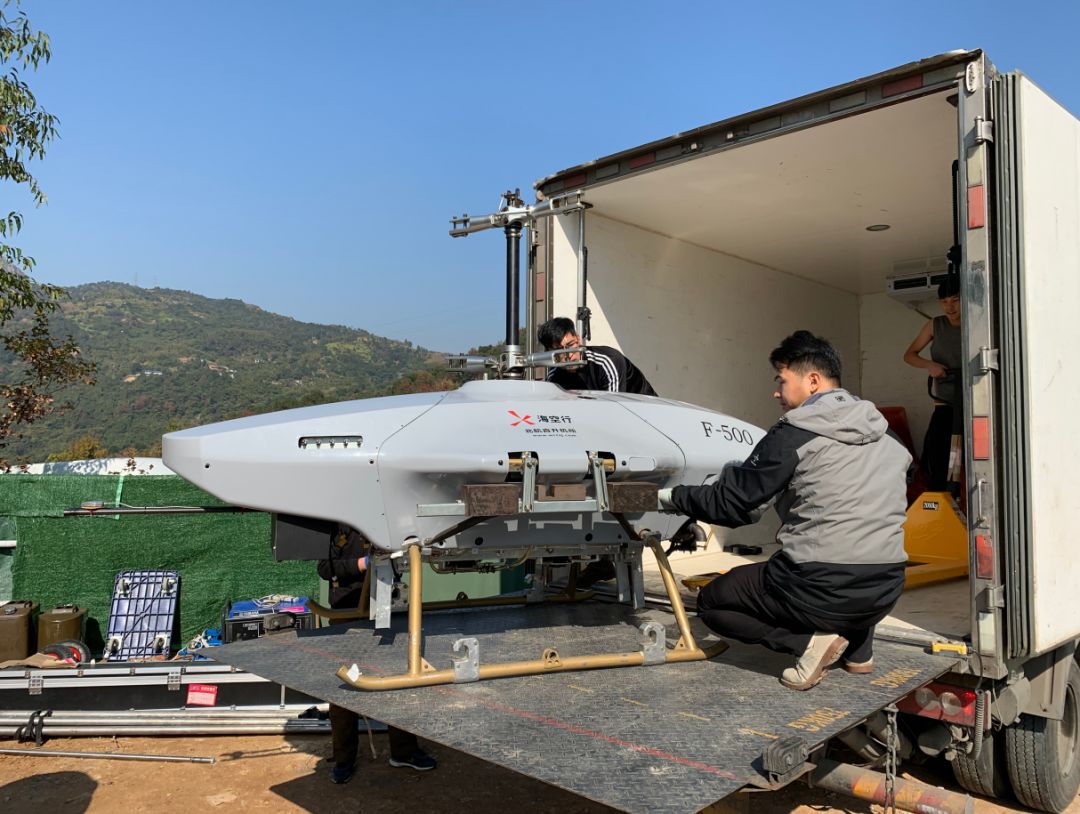 飞行机组在王放博士带领下,仔细勘察了起降和投放场地的环境及空域,制定了详细的航线规划。任务当天,气温闷热,云雾缭绕,随着现场总负责人一声令下,F-500重型共轴式无人直升机挂载总重近200公斤的钢结构件缓缓起飞,脱离地效后进入全自主航线飞行模式,以5m/s的速度沿既定航线平稳地向山顶预定投放区域斜向爬升飞行,桨叶划破空气的声音响彻山谷。接近山顶投放区域后,直升机实施机动动作规避高压线塔。当直升机完全飞抵投放区域正上方后,通过机载摄像头传回的高清影像,机组操作直升机下降高度至投放点上空15米并展开投放动作,当钢结构件准确落在投放点后,直升机沿原航线返航并平稳降落在临时起降点。经过4个架次飞行,吊运投放了全部16根钢结构件。任务结束后,在场人员响起热烈的掌声并争先与F-500重型共轴式无人直升机合影留念,祝贺此次任务圆满成功!