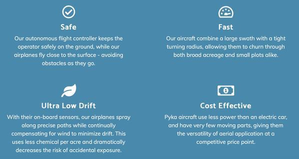 「Pyka」的具体优势是使农业化学品应用更安全、更快速、更低成本。