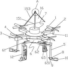 在这份发明专利中,描述了一种防倾倒小型运载无人机,包括主控机舱,主控机舱的四周依次均布有多根机臂,机臂的外侧端固定设有伺服电机,伺服电机的上侧输出轴上安装有螺旋叶片,主控机舱下方依次设有四根支腿,主控机舱与四根支腿之间设有能控制四根支腿收缩或张开的调节机构,主控机舱顶部设有能平衡无人机飞行姿态的平衡机构。
