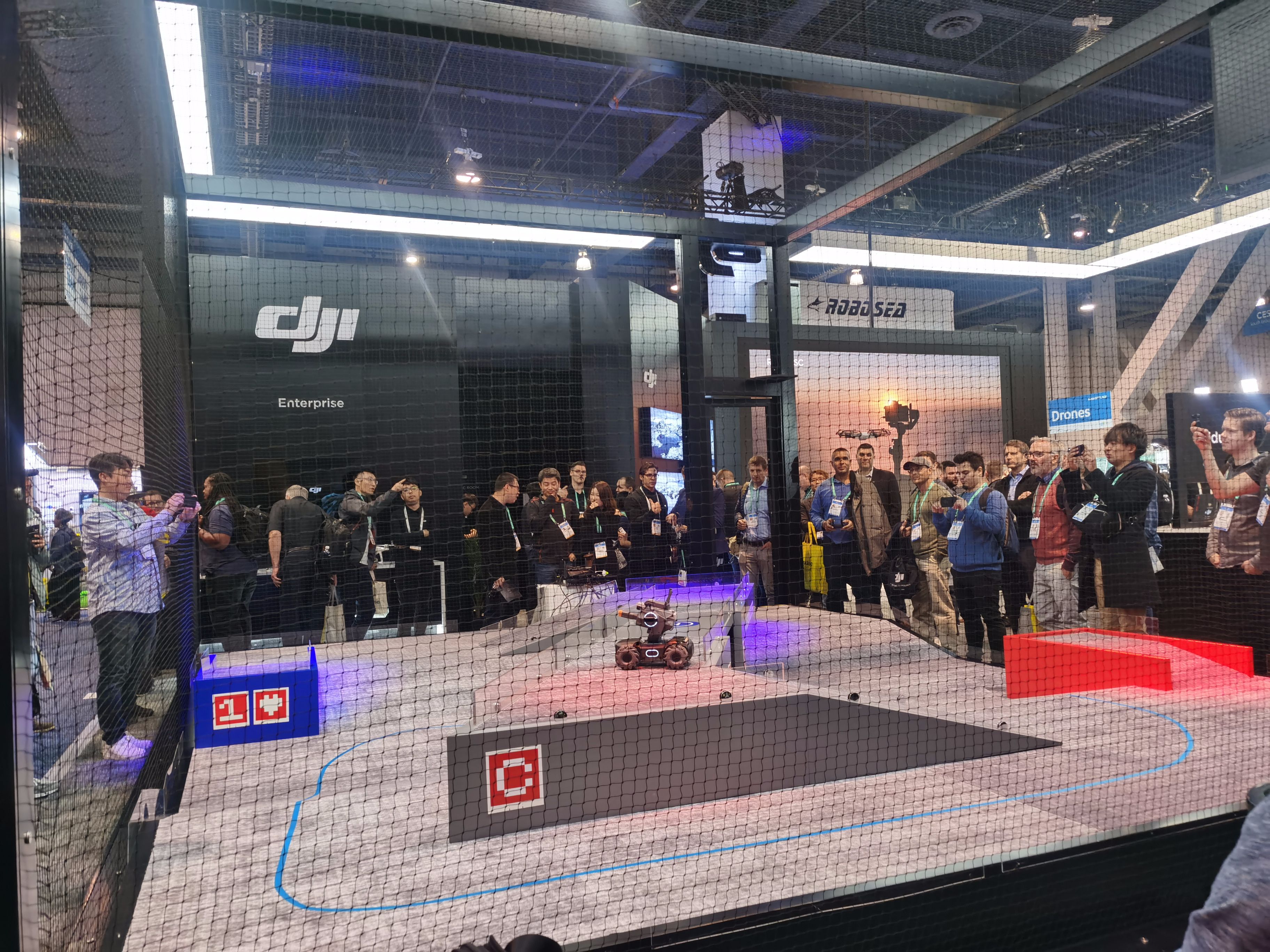 大疆这次的室内场景布置明显与往年有所区别,首次地空一体展示,新增地面场景应用,这都是为更好的展示地面机器人的性能和娱乐性。