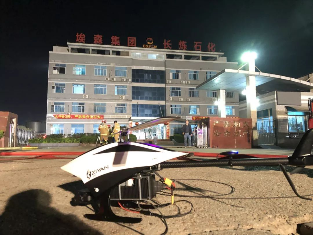 但明火扑灭后,仍不能掉以轻心,事故现场各方力量依然坚守奋战在一线,严防复燃!由于现场环境复杂,需系留无人机进行长时间定点监控,紫燕在当天下午18时接到调度命令后快速出动,派出3名工作人员携带山雀系留无人直升机系统赶赴现场,为事故现场提供有效支持。