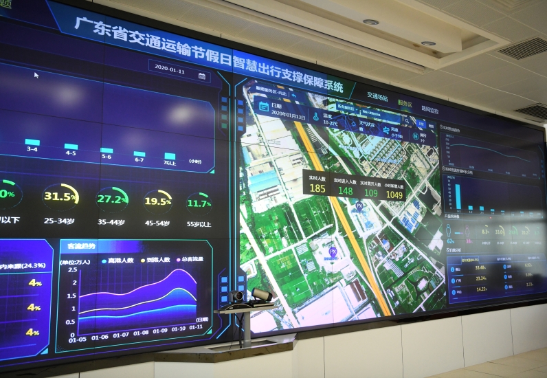 走进广东省交通运输厅春运办指挥中心,迎面是一整面墙的电子屏幕,这就是“广东省交通运输节假日智慧出行支撑保障系统”展示的“窗口”,屏幕上的数字与图表不断地跳动,代表着全省春运期间重点路段、站场等的人流量和路况的变化。