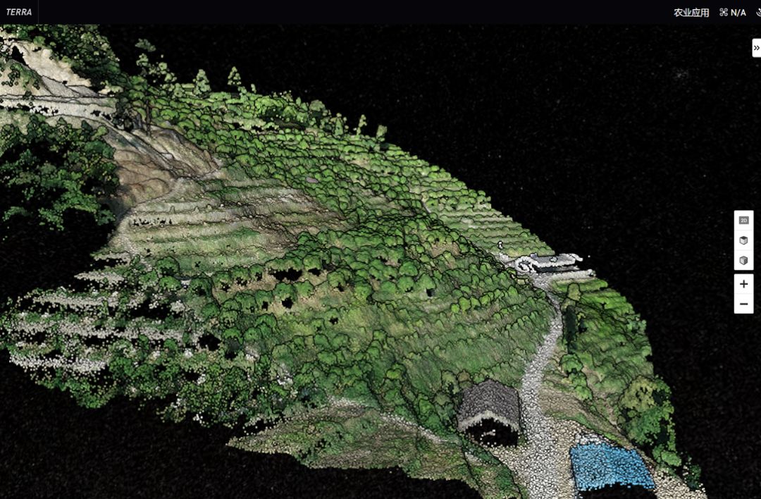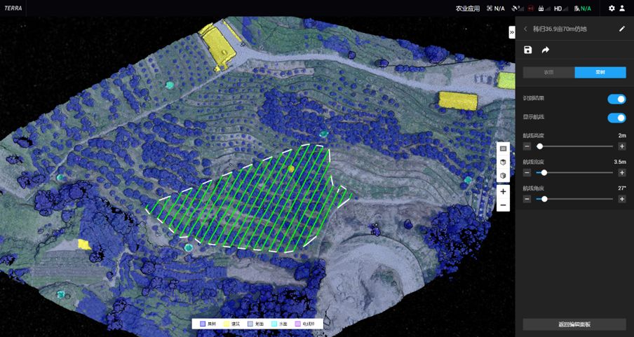 果树模式作业的第一步是使用 P4R(精灵 4 RTK)对果园进行测绘。先设置固定飞行高度为 130 米,用P4R航拍果园的高清图像,再用大疆智图(DJI TERRA)进行建图。由于山头落差较高(>40 米),在此地图上规划的航线高度会有误差,需要进行第二遍的建图。