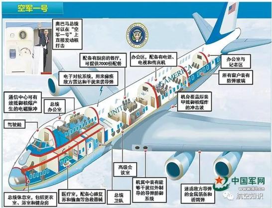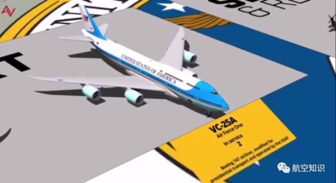 VC-25A "空军一号"(Air Force One)是美国总统的专机,这架蓝白相间的波音747飞机已成为美国的权力象征,也成为美国的国际图腾。空军一号也常被人们称为“空中白宫”。飞机的内饰由当时的美国第一夫人南希·里根设计,采用了美国西南部的设计风格。