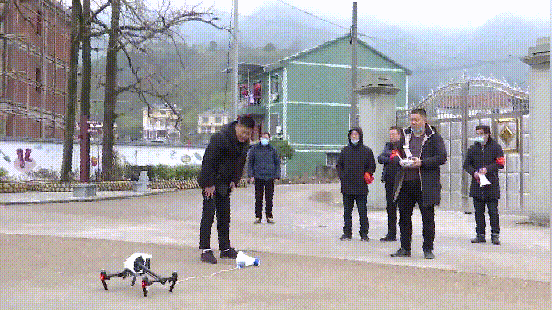 派出无人机喊话的,是大唐街道冠山村。一共有3台无人机执行宣传任务,每趟飞行时间在20分钟左右。无人机的下方绑着一个小喇叭,不停巡回喊话。
