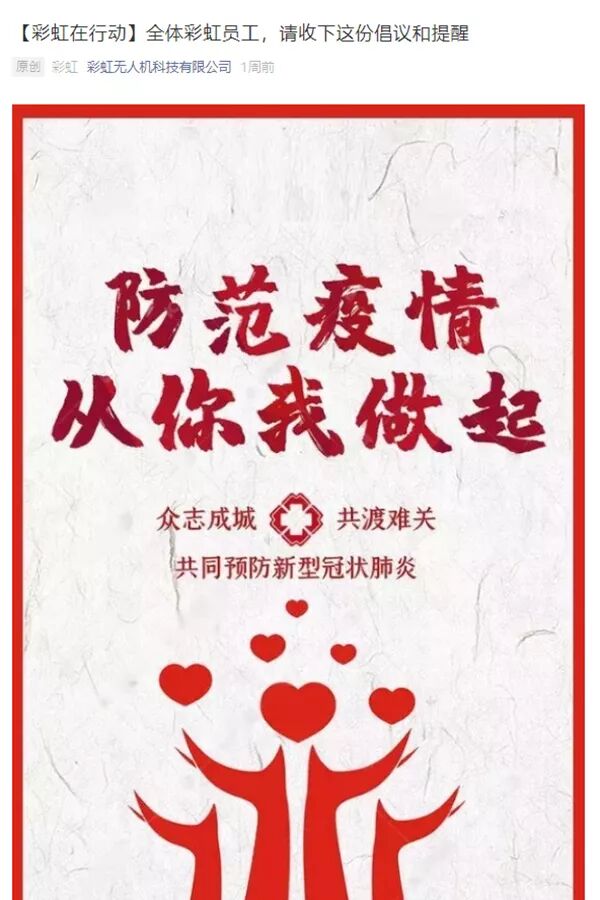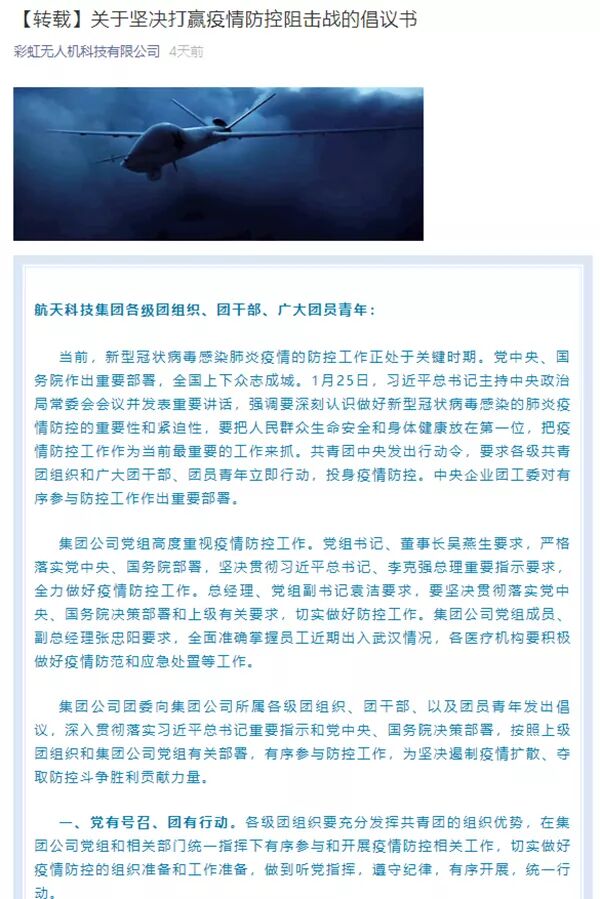 新型冠状病毒感染的肺炎疫情发生以来,党中央、国务院高度重视,迅速作出防控疫情的一系列重大决策部署,集团公司、十一院、航天彩虹无人机股份有限公司也就加强疫情防控工作提出明确要求。疫情就是命令,防控就是责任。彩虹公司党委坚决贯彻党中央和集团党组、十一院党委和航天彩虹股份公司的工作部署,将疫情防控作为当前最重要的工作来抓,统一安排、精心组织、周密部署,积极开展新型冠状病毒感染的肺炎疫情防控工作,多措并举、狠抓落实,各部门大力协同,确保防控工作取得实效,保障职工身体健康和生命安全,保障科研生产和广大职工生活的正常秩序。