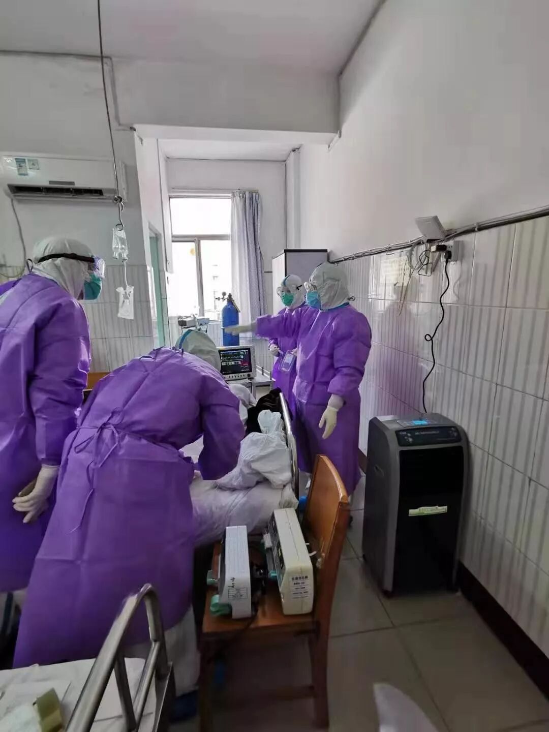 贵州省派出首批137名医护人员驰援湖北省鄂州市,其中就包括航空工业通用医疗三〇二医院、三〇〇医院的14名医护人员。这是三〇二医院支援鄂州的医护人员在鄂州当地医院进行治疗与护理——