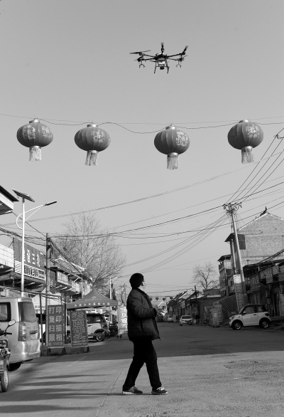 1月30日,焦作孟州市赵和镇冶墙村一联六组农村党员程占国用自己的无人机无偿为村内街道喷药消毒,为全村构筑起了疫情防控网。 白水平摄