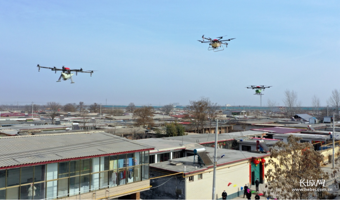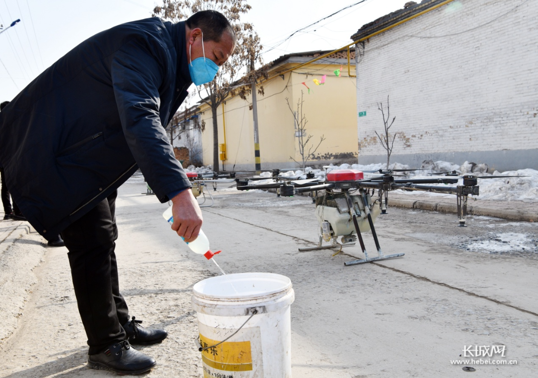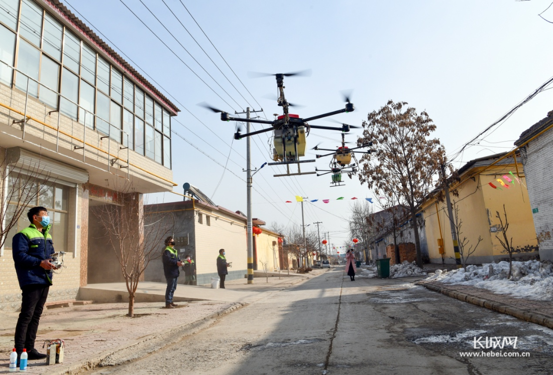 长城网石家庄讯(记者马静 通讯员李明发)2月1日,河北省石家庄市栾城区三架大型农用植保无人机在南高乡温家庄村免费为村庄及主要街道口喷洒消毒液防控疫情。