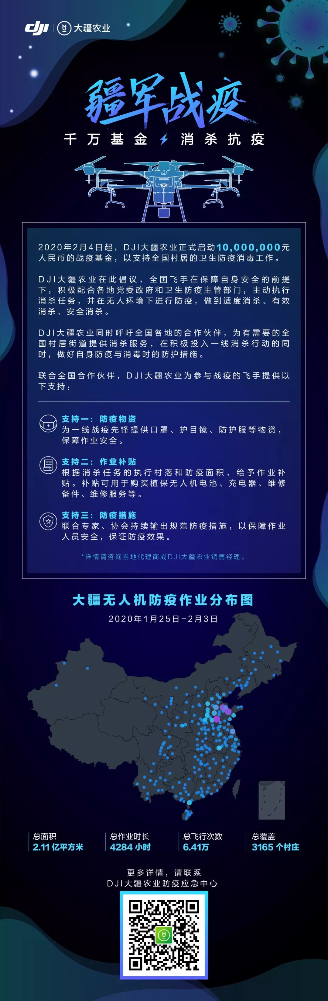 为响应国家的号召,积极履行企业社会责任,DJI 大疆农业现正式发布「疆军战疫」行动,设立 1000 万基金支持各地战疫先锋,并将发布消杀指南等,助力安全防疫。