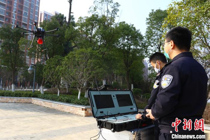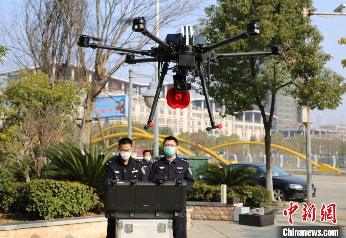 新型冠状病毒感染的肺炎疫情发生后,为更好地防控疫情,江西省瑞昌市公安局启用警用无人机对人员密集公共场所进行巡视、宣传,助力疫情防控工作。 魏东升 摄